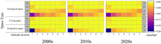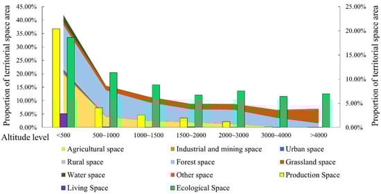 The total area of the territorial space in the seven elevation zones varied greatly. The first level elevation belt was the largest, and the sixth to seventh elevation belts were the smallest. With the increase in elevation, the territorial space showed a more obvious distribution hierarchy (Figure 3).
