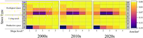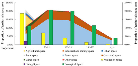 The territorial space area showed obvious gradient differences with an increase in the five slope, and the territorial space use was concentrated mainly in the level 1 slope region (Figure 5).