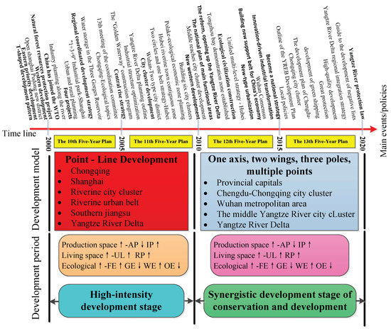 The Yangtze River Economic Belt (YREB) is one of the most active regions in China for the development and utilization of territorial space and also is the most important east west–axis of territorial space development, accounting for 21% of the national area, 40% of the national population, and more than 40% of the total economic output. Since 2000, driven by national policies, the YREB has developed rapidly. In 2020, the region achieved a total gross domestic product (GDP) of CNY 471,580 billion, accounting for 46.6% of the country. At the same time, however, the YREB is also responsible for serious ecological problems [29], and the uncoordinated territorial space development has seriously restricted the high-quality development of the region. Establishing the YREB as a model economic zone of high-quality development is an inevitable requirement against the backdrop of national development in the new era. In 2018, the YREB began “promoting well-coordinated environmental conservation and avoiding excessive development”; high-quality development officially became a national strategy; efficient and reasonable development and utilization of territorial space were established as the foundation of the Yangtze River’s ecological protection. In 2022, scientific planning of territorial space development and protection pattern, establishment and improvement of territorial space management and control mechanism, and speeding up the formulation of a territorial space plan were established as the essential requirements necessary to promote high-quality regional development of the YREB. This series of measures represents the transition of the development of the YREB from a high–speed development stage focusing on territorial space development since 2000 to a high-quality development stage with equal emphasis on development and protection today. Optimizing the territorial spatial pattern and achieving equal emphasis on development and protection is the key to achieving high-quality development of the Yangtze River Economic Belt.