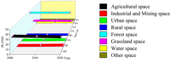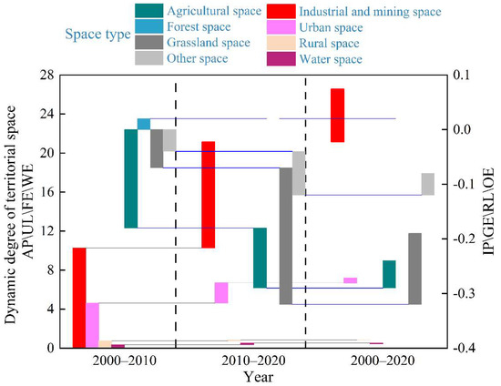 During the period from 2000 to 2020, the dynamic degree of territorial space use in the YREB was 1.99%. From 2000–2010 and 2010–2020, the dynamic degrees of territorial space were 1.90% and 2.00% respectively (Table 5). This result showed that human activities increasingly influenced the territorial space structure during the study period, and the territorial space area has changed more drastically. In general, the production and ecological space in the YREB followed a decreasing trend, whereas the living space followed an increasing trend. Specifically, except for agricultural space, grassland, and other space, the other five types of space expanded, among which the industrial and mining space was the most obvious. The remaining spaces were urban space, rural space, water area, and forestland, which expanded in turn.