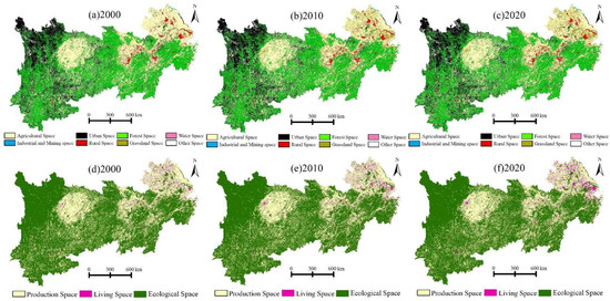 Evolution of the territorial space pattern of the Yangtze River Economic Belt from 2000 to 2020. (a–c) are the spatial distribution of agricultural production space, industrial and mining production space, urban living space, rural living space, forestland ecological space, grassland ecological space, water ecological and other ecological spaces in the Yangtze River Economic Belt in the years 2000, 2010 and 2020, respectively. (d–f) are the distribution of production, living and ecological space in the Yangtze River Economic Zone in 2000, 2010 and 2020, respectively.