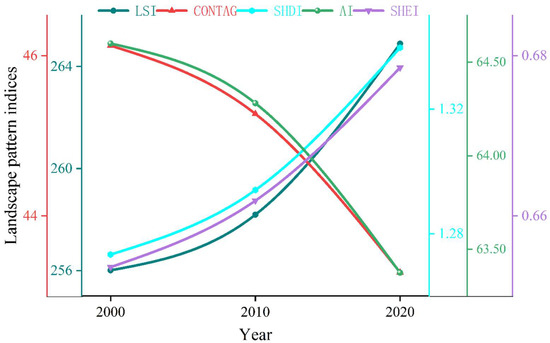 From 2000 to 2020, the indicator LSI increased from 256.0091 to 264.8952, reflecting the increasing degree of fragmentation and discretization of landscape patches during the study period (Figure 13). AI and CONTAG indices decreased from 64.6003 and 46.1252 to 63.3742 and 43.2947, respectively. These changes indicated that the degree of landscape agglomeration tended to weaken; the fragmentation level gradually increased; the connectivity of dominant patches, such as agricultural space and forest in the landscape decreased; and the landscape presented a dense pattern of various elements. This showed against the backdrop of rapid regional development, the influence of other types of space on the disturbance of agricultural space and forestland increased. The SHDI and SHEI indices both increased, and SHDI increased more obviously from 1.2733 to 1.3397. This change indicated that the degree of heterogeneity of the territorial space landscape types has increased, the balance and diversity of utilization have improved, and the pattern tended to be diversified. This change indicated that under the influence of other types of landscapes, the control effect of the dominant patches on the overall landscape was constantly being weakened.