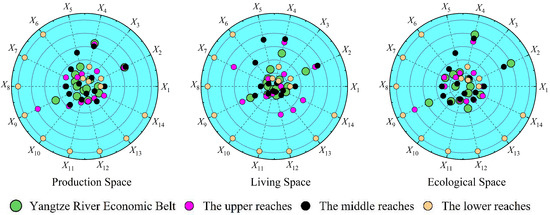 The territorial space of the YREB shows prominent characteristics of geographical differentiation. Production and living space are mainly located in and expand significantly around areas with relatively flat topography and more developed economies, concentrated mainly in the middle and lower reaches. Ecological space such as forestland and grassland are mainly located in less developed mountainous areas with relatively rugged terrain [47], mainly in the upper reaches. However, its expansion area is mainly located in the lower plain with low topography. Since the lower reaches have reached a relatively high level of social and economic development, in order to implement the national environmental protection strategy, the main task is to guide the coordinated development of production, living, and ecological space. In general, the significant regional differences in the territorial space of the YREB hinder its coordinated and sustainable development. It should focus on shrinking regional development differences and promoting coordinated development of the YREB.