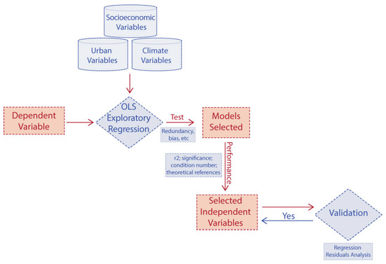This article is structured around two methodological approaches associated with spatial statistics, which appeared in the literature discussion: (1) regression-associated multicollinearity analysis (OLS) and (2) geographically weighted regression (GWR) analysis, of which the data flows are presented as a diagram in Figure 1. These are complemented with some prior statistical significance and multiple collinearity analyses, allowing variables that could be highly correlated with each other to be grouped.