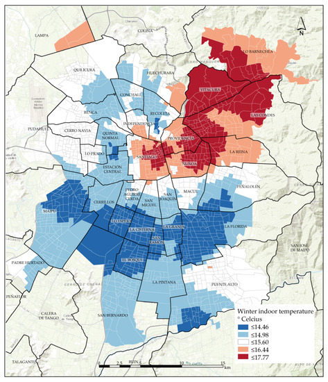 At the national level, the environmental and climatic impacts on the city have been extensively studied at a territorial scale—for example, the configuration of the urban heat island in Santiago de Chile [64,65]—but less so on links with socio-spatial aspects [66]. In conceptual terms, the development of the notion of “territorial energy vulnerability” by the RedPE [67] is a significant advance, though still lacking an empirical analysis that allows the evaluation of the impacts of socioeconomic, urban, and climatic variables at the territorial scale in terms of energy poverty.