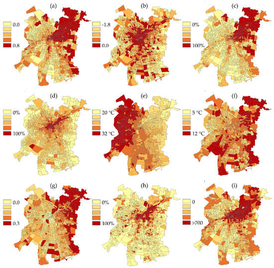 Figure 4. Description of the independent variables, indicating their minimum and maximum values, used in the models to explain the inside temperature of homes in the metropolitan area of Santiago: (a) SMTI; (b) land-use heterogeneity; (c) percentage of professionals; (d) percentage of households without children; (e) 2017 annual thermal amplitude; (f) 2017 winter LST; (g) 2017 NDVI; (h) percentage of flats; and (i) average values of land prices expressed in US$/m2.