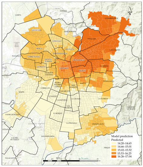 • Eastern Area: in Santiago’s metropolitan area, the higher income sectors are concentrated in “a sort of triangle that has one of its vertices in the commune of Santiago and then stretches towards the northeast, covering a good part of the mountain slopes” [79]. The so-called “high-income cone” [80] has been characterized by processes of spatial self-segregation [81]. In the model, it is expressed with a defined pattern to the dependent variable. Here, there are high inside temperatures transversal to the communes that compose it (Ñuñoa, La Reina, Providencia, Las Condes, Vitacura, and Lo Barnechea). Specifically, the highest values occur in the eastern boundary of the commune of Santiago, the northeastern zone of Ñuñoa, west of La Reina, the vast majority of Providencia and Las Condes, the western sector of Lo Barnechea, and uniformly for the entire commune of Vitacura (Figure 3). The general pattern is reinforced with the four variables of the model. Still, specifically for the highest temperatures, the variables that operate at the local level are the material of the home together with the annual thermal amplitude. This situation is evident when observing the agglomeration of high-temperature sectors in Santiago, which also coincides with the higher percentages of professionals and a greater vegetation cover and green areas expressed in the NDVI (Figure 5). In terms of standardized residuals, the most overestimated place is the foothills of this high-income cone (expressed through lower temperatures in winter), where the geographical factor prevails. The opposite case occurs in some vulnerable enclaves of these communes where the percentage of professionals decreases as well as the material quality of the homes. Still, the other environmental variables remain constant, causing the model to underestimate the observations.