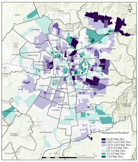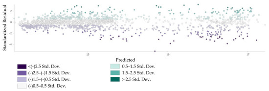 In general, terms, the model applies very well given the equilibrium provided by having a multivariate explanatory function (Figure 6). At the same time, the condition number, which accounts for local multicollinearity, is below the limit of 30 in all the census tract units, which shows the feasibility of the GWR model. This indicator is especially significant considering that the dependent variable (indoor temperature of the houses) comes from an interpolation. However, the standard deviation of the standardized residuals accounts for better fits in some map locations (greater than 2.5 standard deviations correspond to estimated differences versus the observed of only 1.4 °C) (Figure 7). With this, in terms of methodological aspects, it is possible to affirm that local multicollinearity can be increased slightly—consistently within the acceptable range of the GWR model—to obtain stronger arguments for analyzing the results.