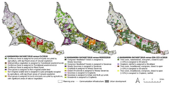 Spatial distribution of dominant land cover differences between the KASSANDRA DATASET2018 and (a) CLC2018, (b) MODIS2018, and (c) ESA-CCI-LC2018 land cover products.