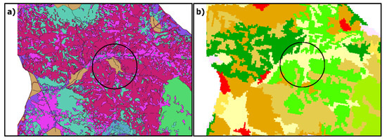 The biggest difference for MODIS2018 was also found for the forest class, since a substantial part of the coniferous forests in this product’s central and southern part of Kassandra is represented by the classes Woody Savannas (Code: 8) and Savannas (Code: 9) instead of the ground truth class Evergreen Needleleaf Forests (Code: 1). This inconsistency is evident in 21.16% of the study area, and it might occur because the ground truth class Evergreen Needleleaf Forests that has been treated for either fire protection or disease reasons is falsely classified due to the low canopy cover and absence of understory. The underestimation of forest areas is also observed in the ESA-CCI-LC2018 product. Thus, 98.83 km2 of the classes Tree cover needle-leaved (Code: 70) and Tree cover broadleaved (Code: 50) (forest areas) were categorized in the class Shrublands (Code: 120), while an additional area of 10.65 km2 of the class (Code: 50) was depicted as the non-forest class Cropland rainfed (Code: 10) in the ESA-CCI-LC2018. One of the main reasons for this underestimation might be due to the different interpretations of how forest land cover is defined among various countries. A lower or higher tree (crown) cover threshold for example might differentiate different forest classes, as shown in previous work [48,60,61]. The cross comparison of the examined datasets with the reference classification is available in Tables S1–S3 in Supplementary Material S2.