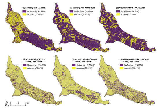Based on a comparison of the reference dataset with the three land cover products, CLC2018 demonstrated the highest overall accuracy of 37.47%, while MODIS2018 and ESA-CCI-LC2018 revealed similar percentages that did not exceed 22% (Table 5), indicating that CLC2018 depicted more precisely the characteristics of the landscape than the two other products. The reason for that might be the higher resolution and the more detailed cartographic representation that CLC2018 offers in comparison to MODIS2018 and ESA-CCI-LC2018. The spatial distribution of the agreement and differences of the total land cover mapping in the case of CLC2018 indicated inconsistencies in the southern part of the peninsula that is mainly occupied by forest areas. On the contrary, the inconsistencies observed for the other two products were evenly distributed throughout the study area (Figure 3a–c).