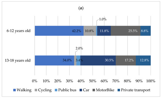 In the survey, there were two age groups: 6–12 years old (primary school), which made up 33.44% (N = 102), and 13–18 years old (secondary school), which made up 66.56% (N = 203). Children aged 6 to 12 years old had a higher percentage of students who walked to school (42.2%) and rode bicycles to school (10.8%) compared to those aged 13–18 years old, where only 34.0% walked and 2% rode bicycles. The older group utilized vehicles (30.5%) and private transportation (12.8%) more than the younger group, which used cars (11.8%) and private transportation (8.8%) (Figure 5a). For children aged 6–12 accompanying their parents, motorcycle (25.5%) was the second most favored form of transportation, while for children aged 13–18, motorcycle (17.2%) was the third most popular mode of transportation after walking and automobile use.