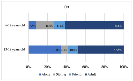 Figure 5b illustrates the situation, showing that although children aged 6 to 12 traveled more by foot and bicycle, they were typically accompanied by an adult or an older sibling due to safety concerns; however, those aged 13–18 were more independent and traveled alone. Even though half of all parents in the sample were employed, the majority of parents of children who walk to school were unemployed, indicating that children with a stay-at-home parent were likely to walk or bike to school.