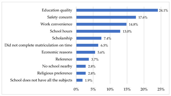 Not all children in the Dominican Republic are assigned to a public school based on their domicile. That is, parents in the Dominican Republic can choose the school of their choice regardless of geography, indicating class stratification. Families have seemingly been left with little choice but to send their children to private schools due to the shortcomings of the public education system [83]. One of the unique questions in the parent survey queried why parents had not selected the school closest to their residences (Figure 6). Parents can select the school that best meets their child’s needs based on enrollment availability and accessibility. In addition to the disparity in educational quality (24.1%), safety concerns (17.6%) were cited as a major factor. This indicated that parents were concerned about child pedestrians being involved in accidents in the neighborhood. Also ranked highly was job convenience (14.8%), implying that parents chose a school that was on their way to work so they could drive their child there.