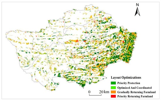 | Towns | Priority Protection/hm2 | Optimized and Coordinated/hm2 | Gradually Returning Farmland/hm2 | Priority Returning Farmland/hm2 |