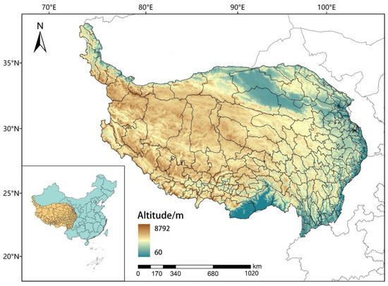 The aforementioned studies have enriched the developments in human settlement science in China; however, most of them are concentrated in the developed or low-altitude regions of China, leaving the depth of research on the impoverished, high-altitude and fragile regions relatively scarce. Most of the current research on human settlements focuses on the large-scale comparative analysis of cities and regions. The evaluation of human settlements at the county scale is scarce. The socioeconomic development of the inner space in the same region is not completely similar, and human settlements differ in numerous aspects. Human settlement analyses have shown that development problems abound at the county level. In addition, existing data are mainly gathered from statistical data or questionnaires, which entail a large workload and certain subjectivity. The Qinghai–Tibet Plateau (QTP), which is known as the “roof of the world”, covers an area of about 2,581,300 km2, with an average altitude of about 4400 m, and is the home of more than 10 million people [20]. With significant climate differences, an uneven precipitation distribution, and a strong solar radiation factor in the QTP, the daily and annual temperature differences are large, but the accumulated temperature is small. With poor natural environmental conditions and facing massive development and utilization challenges, the area is unattractive for human beings. Therefore, the social and economic development of the QTP is relatively backward, and the contradiction between economic development and environmental protection is prominent. For the Qinghai–Tibet Plateau (QTP), with its large area and low population density, statistical data are scarce. The quality of human settlements in the plateau is also difficult to evaluate using previous research methods. Therefore, the comprehensive evaluation of human settlement quality still needs to be comprehensively and systematically studied. Reasonably evaluating the current human settlement quality is of great significance. The obstacles restricting the improvement of the human settlement environment should be explored as a means of optimizing population distribution, coordinating development at the regional level, and promoting rational urban and rural planning.
