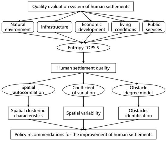 Scholars have initiated extensive studies on human settlements. The research on human settlement mainly focuses on the natural suitability [4,35,36], comprehensive suitability or adaptability [18,20,23,37,38], quality [5,6,39,40], sustainability [41,42], satisfaction [43,44], livability [22,45,46,47,48], vulnerability [49,50,51], and internal coupling coordination of the system [2,52,53]. The research on the natural suitability of human settlements has earned widespread attention. Remote sensing and other technical approaches have been used to evaluate the suitability of human settlements. By analyzing terrains, climate, and other factors, the human settlement index, at a corresponding scale, can be used to explore the spatial relationship between the natural environment and human settlement distributions [7]. For example, the suitability of human settlements was evaluated in Kastamonu, Turkey, from the perspective of the climate [54]. Scholars have also studied the impact of urban traffic, landscape, and infrastructure on the livability of cities [47,55,56,57,58]. The comprehensive evaluation of human settlement quality has also attracted wide attention. Human settlement quality evaluation requires the obtainment of quantitative and qualitative information on the quality of a specific human settlement environment. The aim of the quality evaluation is to improve the capability of identifying changes in human settlements, ensuring that the human settlement quality remains in a range that is necessary for human living and development, and accordingly, adjusting human social behavior. With these goals, the quality of human settlements will likely develop towards a direction that is more conducive to the survival and development of human society under the action of human social behavior. The study scale of human settlement mainly includes the macroscale, with regions and provinces as the basic units, and the microscale, where cities and counties act as the basic units [5,6,39,40,59,60]. The study methods mainly include the analytic hierarchy process, principal component analysis, the Delphi method, the entropy method, and other related approaches [61,62,63,64]. Gu and Liu [62] evaluated the human settlement quality in Jianghuai of the Anhui Province by using the entire-array-polygon composite index. Their results showed that human settlement quality in Jianghuai is high in the east and low in the west, and water resources, infrastructure, and other factors presented the most significant impact. You et al. [63] took Ganzhou as a case study and found that the social and cultural environments had the largest weight in the system of the human settlements, using entropy TOPSIS (i.e., a technique for order preference by similarity to the ideal solution). Rong and Jia [64] found that the quality of rural human settlements in Inner Mongolia has a spatial pattern in the order of agricultural area > forest area > pastoral area. Xie et al. [5] studied the influencing factors on human settlement quality in Beijing using the panel data model. Bin et al. [65] looked at the county scale as a research unit and discussed the influencing factors on human settlements in the Guangdong Province using the spatial regression model. Zhou et al. [66] constructed an index system of human settlements with 10 index factors and explored the spatial aggregation and differentiation of human settlement quality. Li et al. [67] evaluated and analyzed the differentiation and controls of human settlement in Jinan using multisource data, spatial density analysis, and a gravity model. Zhu et al. [68] took downtown Fuzhou as a research area and found that convenient transportation and complete service facilities had a greater impact on human settlement quality using TOPSIS.