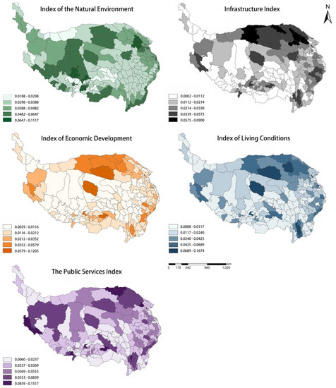 Figure 3. Spatial distribution of first-level indicators for human settlement quality in the Qinghai–Tibet Plateau.