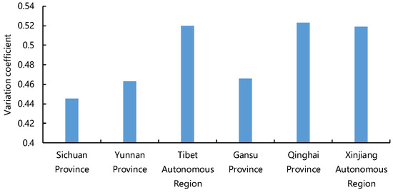 The coefficient of variation is a statistic used to measure the variation degree of each observed value in a group of data. In this study, variation analysis was conducted on the evaluation results of the counties in the QTP by referring to the situation of the different provinces. In this manner, the variation degree of human settlements in the counties of the different provinces could be explored.