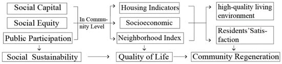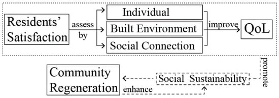 The people-oriented regeneration mentioned in the 14th national Five-Year Plan is intended to promote a sense of happiness and well-being for residents, from physical space, standardization, and implementation to social, incentive, and comprehensive regeneration []. The interest among old communities in a high-quality living environment and resident satisfaction were informed by assessments of QoL [,,,]. In this way, through the prism of QoL, social sustainability and community regeneration could be synchronized (Figure 1).