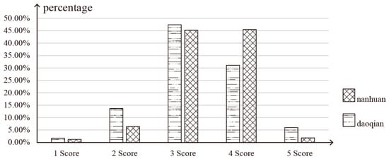 In a general overview of the average level of overall satisfaction of the residents, Daoqian, where traditional structures and urban open spaces are conserved, offers worse living conditions, e.g., smaller living areas, to an aging population with a low income than the newer Nanhuan. On account of this, the overall satisfaction was low and the distribution was concentrated (Figure 6). A further detailed analysis showed how the two communities have different expectations.