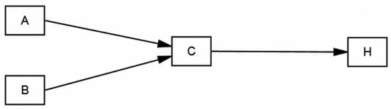 The structural equation model (SEM) is a research method based on statistical analysis technology. It can deal with complex multivariable research data analyses. Joreskog proposed a multivariate statistical analysis method to analyze the complex relationship structure between multiple index variables by using a SEM; this was one of the three significant advances in statistics in recent years []. The SEM overcomes the limitations of traditional statistical methods, making it an important tool for multivariate data analyses. It is suitable for three-dimensional and multi-level analyses and can exist in human thinking forms. It can analyze variables (i.e., latent variables) that cannot be directly measured, quantify the causal relationships among various factors, and carry out various subdivisions and comparisons. As shown in Figure 7, a and B are observation variables used to characterize latent variable C, and C influences H. Therefore, this paper used SEM to analyze the results from our resident satisfaction questionnaire.