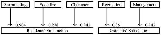 Using the maximum variance orthogonal rotation statistical method, the influencing factors in Nanhuan were found to be: “surroundings”, “socializing”, “community”, and “character”. Table 5 shows the significant factors and the corresponding variables. The influencing factors obtained from Daoqian were: “individual”, “recreation”, “management”, and “vitality”. Table 6 shows these significant factors and the corresponding variables.