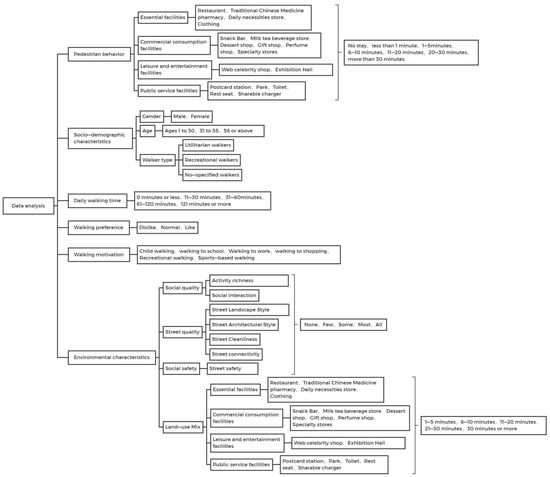 “Socio-demographic characteristics” include gender, age, education, profession, and income. There are two categories of gender: male and female. The ages are divided into three categories: 1–30, 31–55, 55 or above. Street walkers are divided into utilitarian walkers, recreational walkers, and no-specified walkers. Utilitarian walkers mainly walk for commuting between home and school or workplace. Recreational walkers mainly walk and jog. The no-specified walkers mainly walk for daily affairs, such as going shopping, going to hospital, visiting friends, and doing some commute-related things.