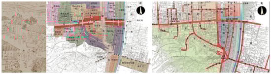 paintings in the past (left), Street pattern map of southern Song Dynasty (middle) and Street pattern map of Ming and Qing Dynasties (right). (online website https://jz.docin.com/p-2811341437.html accessed on 22 November 2021).