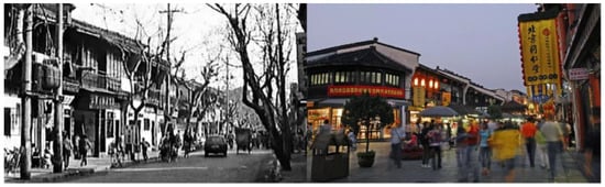 Photos of Hefang Street in 1966 (left) and the current (right). (online website http://www.360doc.com/content/20/0812/10/17132703_929812656.shtml accessed on 25 November 2021).