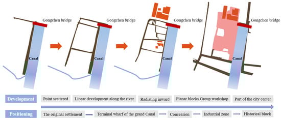 Morphological evolution of Gongchen Bridge Block. (Self-painted according to the historical evolution of Gongchen Bridge).