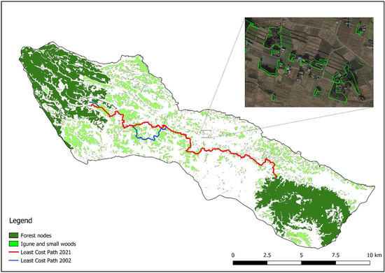 The results of the LCP analysis are particularly interesting. Most of the path of 2002 and 2021 overlap, with overall lengths of 23,647 m and 21,918 m, respectively, and shared length of 17,957 m. The different spatial metrics calculated for the LCPs (Table 3) show that these features play a crucial role in connecting the two forest nodes (Figure 2), as demonstrated by the fact that approximately 90% of the paths pass inside more than 70 different igune and small woods. The LCP of 2002 is longer but is more included within igune and small woods than the one of 2021 which, on the other side, is shorter. Therefore, considering also that the values of maximum and average length of the segments falling outside igune or small woods are almost the same, the LCP analysis confirms that the situation is basically unchanged in the last 20 years.