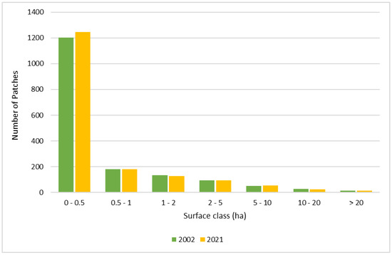 Despite it seeming that there is a great variability in the surfaces of igune or other small woods, it has to be considered that 82% of these patches has a surface smaller than 1 ha, 16% has a surface between 1 and 10 ha and only 2% has a surface greater than 10 ha; the situation is almost the same for 2002 and 2021 (Figure 3). The quartiles analyses confirm that most of these features can be considered of small size (Table 2).