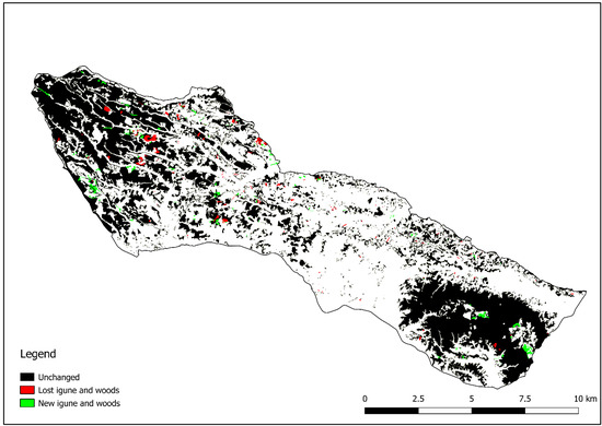 The landscape metrics and spatial analyses have been applied both to 2002 and 2021 to assess the landscape changes that may have affected the igune in the last 20 years. The two maps have been intersected to check the losses and the gains of igune and other small woods. The polygons where igune and other small woods disappeared in the last 20 years have been checked again to identify the new land uses that replaced them and, therefore, to identify the main threats.
