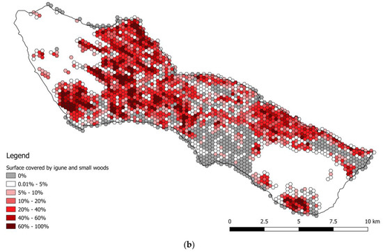 The analysis of the density of igune and other small woods based on the hexagon grid (Table 4) shows that most of the hexagons (81% for both 2002 and 2021) include totally or partially one or more of these features, ranging from 1 feature (in 680 hexagons on a total of 2208 for 2002 and in 662 hexagons on a total of 2194 for 2021) up to 9 features (in 2 hexagons for both 2002 and 2021), with an average value equal to 1.8 patches/hexagon for both 2002 and 2021. Regarding the percentage of surface occupied by igune and other small woods per each hexagon, most of the hexagons fall into the range 0.1–10%, but some of them also reach the class 90–100%. As the situation is almost identical for 2002 and 2021 (Table 4) it was decided to include only the maps of 2021 (Figure 6), which allow us to make some further considerations. The map of the count of igune and other small woods per hexagon (Figure 6a) highlights that the hexagons containing a higher number of these features (from 5 to 9) are located in some specific portions of the study area, while at the same time, the map of the surface occupied by igune and other small woods per hexagon (Figure 6b) shows that higher percentages are located near the big forest node in the north-western part of the study area. This is due to the fact that this big forest node tends to split in wider but separated patches of forests, while the portion of the study area near the south-eastern forest node is mainly characterized by smaller but very dense igune and other small woods patches.