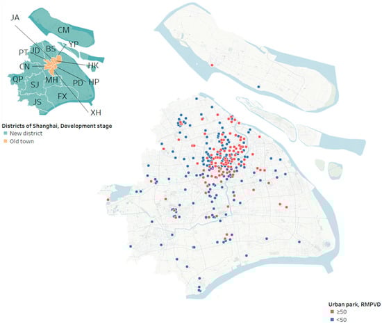 As one of the most developed and attractive cities globally, the metropolitan area of Shanghai, China, has an advanced economy, is densely populated, rich in culture, and favorable in appearance []. It has 24.87 million permanent residents and covers an area of 6340.50 km2 (http://tjj.sh.gov.cn/, accessed on 1 January 2020). With a per capita park green space area growing from approximately 7.6 m2 in 2015 to 8.5 m2 in 2020, Shanghai’s green space quantity and quality are ever-improving []. However, its green space is limited and precious and needs good planning and management to improve citizens’ recreation efficiency. In this study, Shanghai has been chosen as a testbed, given its need for an increased supply of green space, its world-class metropolitan area, and its favorable conditions for a data foundation for this study (i.e., excellent network coverage, a high level of urban digital information penetration, and widely used social media). This study focused on all the urban parks in Shanghai city (Figure 1). These 300 urban parks are located across the 16 districts of Shanghai and are the primary green spaces for recreation for citizens. They were rated with a star rating of urban parks on five levels (i.e., 5, 4, 3, 2, and 1 star) by the Shanghai Administration Department of Afforestation and City Appearance []. Their prospect as a tourist attraction was graded on five levels (i.e., 5, 4, 3, 2, and 1 A) by the Ministry of Culture and Tourism of the People’s Republic of China (Table S1).