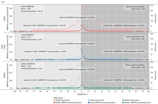 Within the study period from 1 May, 2018, to 30 April, 2019, more than 99.00% of the RMPVDs with an SSRMPVD between −100 and 100 from all three SMD sets, covering more than 220 parks, were used as valid data for the analyses in this study (Figure 2a). Of these RMPVDs, there were 115 parks with an RMPVD count above 50 at all three platforms (Figure 1). In general, tourists have positive emotions at the three SMD sets. Visitors’ RMPVDs appeared more positive on the platform, DZDP, with the greatest mean SSRMPVD of 3.96 (Figure 2a). By contrast, visitors’ RMPVDs on the platform Weibo showed the most emotional calmness for the least mean SSRMPVD of 0.41. As for the proportion of emotions for each category, platform DZDP has the largest proportion of positive RMPVDs (with SSRMPVD > 0), 76.75%, which is slightly larger than that of Ctrip, 67.74%, but much larger than that of Weibo, 26.20%. Actually, Weibo RMPVDs were largely neutral (with SSRMPVD = 0) with a proportion of 63.41%. As shown in Figure 2a, the RMPVDs with an SSRMPVD from 0 to 10 accounted for the majority in all three SMD sets, not only for the RMPVD counts, but also for the number of park coverings. The distribution of SSPVDs for parks with valid data were shown in Figure 2b. Similar to distributions of SSRMPVDs, DZDP has the highest minimum, maximum, and mean SSPVD, and Weibo has the lowest. For Weibo, SSPVDs were mainly around 0, accounting for 70.43%.