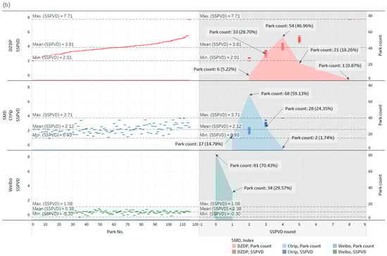Descriptive statistics of SSRMPVD (1 May 2018–30 April 2019): (a) all SSRMPVDs between −100 and 100; (b) SSPVDs for the parks with an RMPVD number greater than 50.