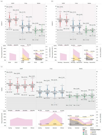 The results of the park sentiment temporal graphs reveal the distribution and variation characters of SSDVDs in different time periods, by year, season, and workday/non-workday (Figure 3). No matter which time period, the means of the SSDVDs for the three SMD sets were all positive. The platform DZDP has a higher SSDVD mean than the other SMD sources and maintains a 100% proportion of positive sentiment for any time period. By year, the three SMD sets all have higher means of SSDVD in 2019 than 2018 (Figure 3a). Standard deviations of SSDVD were smaller, showing less polarized emotions in 2019 than 2018. This indicated that visitors’ emotions for the parks were becoming more positive and constant in 2019 than 2018. The platform Weibo has more days for positive emotion on non-workdays. The other SMD sets have almost the same days for positive emotion on workdays and non-workdays (Figure 3b). However, the standard deviations of SSDVD for all the three SMD sets were smaller on non-workdays than workdays. This indicated that park visitors tend to have less polarization in their emotions on non-workdays than workdays. By season, different platforms have different situations (Figure 3c). The SMD of DZDP and Ctrip have relatively high SSDVD means and more days and lower standard deviations of positive emotion in spring and winter. Similar pictures are presented in autumn for the SMD of Weibo. This indicates that more positive park moods occurred in spring and winter for DZDP and Ctrip and in autumn for Weibo.