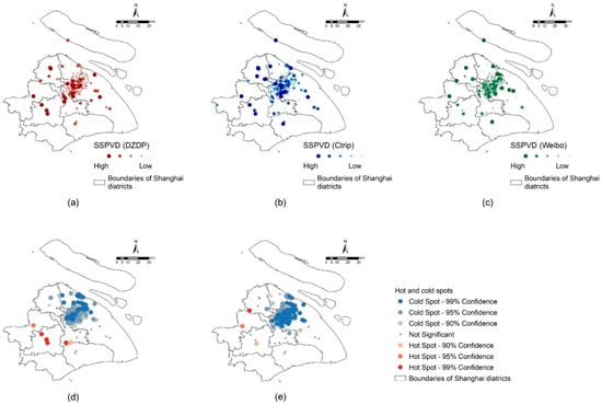 The spatial distribution of SSPVD: (a) geographic map for DZDP; (b) geographic map for Ctrip; (c) geographic map for Weibo; (d) hot-spot map for DZDP; (e) hot-spot map for Ctrip.