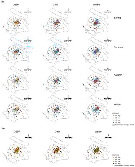 For DZDP and Ctrip, spring has more parks with a higher SSPSVD than the other seasons on average (Table 1). These parks are not only located in the downtown area, but also in the built-up areas outside the downtown area (Figure 5a). Standard deviations of SSPSVD for the parks calculated in spring were lower than those of the other seasons (Table 1). This suggests that parks in Shanghai generally and more consistently bring more happiness to visitors in the season of spring than the other seasons from the SMD of DZDP and Ctrip. Similar conditions occurred in autumn for the SMD of Weibo, shown in Table 1 and Figure 5a, indicating that visitors have a higher mood in autumn in parks. Moreover, in summer from DZDP and Ctrip and winter from Weibo there are less parks with an SSPSVD above the season average (Table 1). These parks were all generally concentrated in the downtown area (Figure 5a). This suggests that parks in built-up areas outside the downtown area bring less happiness for the users of DZDP and Ctrip in summer and for the users of Weibo in winter than the other seasons.