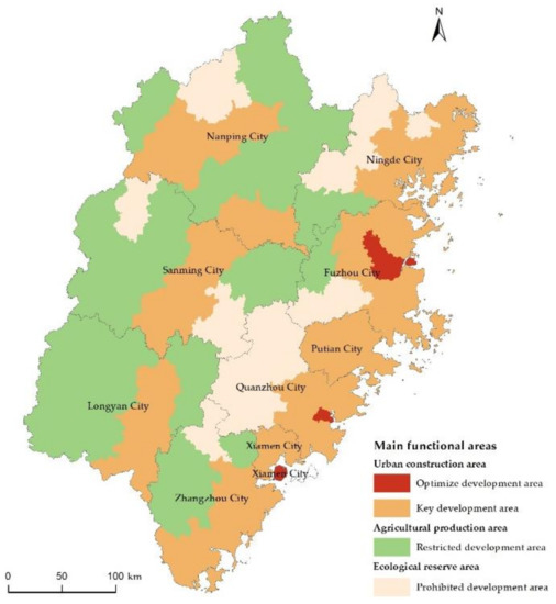 Fujian Province is located on the southeast coast of China. Its land area is between 23°33′~28°20′ N and 115°50′~120°40′ E, with 11 county-level cities, 42 counties, and 31 municipal districts under its jurisdiction (Figure 1). For years, Fujian Province has persistently promoted the construction of ecological civilization. To achieve green, circular, and low-carbon development, it has focused on building a spatial pattern of saving resources and protecting the environment and is the first national ecological civilization pilot zone. The land type of Fujian Province is mainly woodland with a forest coverage rate is 66.8%. This ranks first in the country for 42 consecutive years, and it is an important carbon sink space in Southeast China.