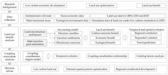 Land space is the basic unit of natural resources and social and economic activities [1]. The development and utilization of land space is a key measure for China to accelerate the formation of green production methods and lifestyles, promote the construction of ecological civilization, and guide regional low-carbon and green development [2]. The development and change of land space is a complex system. Changes in land-use patterns not only reflect the utilization of regional land resources, but also directly affect regional carbon emissions, social and economic development, and ecological environment construction, to a certain extent. This not only reflects the comprehensive level of regional land-use efficiency, but also guarantees our food security from the perspective of arable land. Recent years have seen rapid economic development and an increase in land demand. Along with the transitional development and extensive utilization of resources, the contradiction between land resource development and ecological environmental protection has become increasingly prominent. The concept of sustainable development is receiving more and more attention from countries around the world, and the efficient use of land resources is the key to realizing the maximization of regional land-use efficiency and green sustainable development [3]. Major cities around the world are already exploring low-carbon land-use models [4] and healthy city construction [5]. The implementation of the low-carbon sustainable city plan will enhance the livability and health of the city and promote the construction of a healthy city [6]. Therefore, in the context of low-carbon development, land use structures should be adjusted to optimize the allocation and rational use of land resources. Coordinating the relationship in this way requires the scientific evaluation of carbon emissions, economic and ecological benefits of regional land use. Reducing carbon emissions and improving the effectiveness of land use and the level of coupled and coordinated development are hot issues in the field of national land space and land use [7].