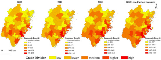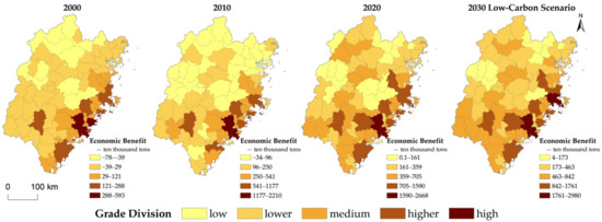 From 2000 to 2020, the overall economic benefits of land use in Fujian Province increased. From the historical development trend (Table 8) under the natural development scenario, the economic benefits of land use in counties (cities, districts) in Fujian Province increased rapidly. The economic benefits of each functional interval were significantly different. Under the 2030 low-carbon development scenario, to achieve the goal of carbon emission reduction, the artificial surface area is limited. This is the main carbon source and inhibits the economic benefits of land use, resulting in slightly lower economic benefits than the natural development scenario. However, the overall economic benefits of each functional area are still growing rapidly. From the perspective of spatial evolution (Figure 6), the differences in economic benefits among regions are obvious. In the past 20 years, the high-value areas of economic benefits are mainly distributed in the central areas of coastal cities and counties, such as Fuzhou, Quanzhou, Zhangzhou, and inland cities. The low-value areas of economic benefits are mainly distributed in the western and northern regions. On the whole, the spatial distribution characteristics follow a “high in the east and low in the west” trend. From 2000 to 2030, the number of low economic benefit areas decreased, and the number of high economic benefit areas increased significantly compared with previous years. The difference in economic development between regions is narrowing. Under the low-carbon development scenario in Fujian Province in 2030, assuming continuous economic development, the intensity of land development increases. The coastal economic development zone is formed with Fuzhou and Xiamen-Zhangquan metropolitan areas as the core. Middle- and high-value areas of economic benefit will appear. These will mainly rely on the core economic zones of Longyan, Sanming, and Nanping and spread to the surrounding cities and key counties, gradually narrowing the scope of the low-value areas of economic benefits. Meanwhile, a larger range of middle- and high-value areas will be formed and concentrated. The distribution of the low-benefit areas is relatively higher in Ningde City.
