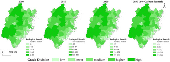 Comparing the ecological benefits of the natural development scenario with the low-carbon development scenario informs how to further implement the ecological strategy in Fujian Province and accelerate the construction of ecological civilization. The ecological benefits of land use in each county (city, district) steadily improve, and the relative economic benefits are less affected by the land use structure. We selected agricultural production areas and ecological reserves that restrict development and construction for the study. The agricultural production area is mainly to provide agricultural products, ensuring that the quality of arable land is not reduced. The increase in arable land enhances the function of agricultural production, and the contribution of ecological benefits reaches 37%, which provides a guarantee for national food security. The ecological reserve, on the other hand, is a key ecological function area, and the main function land types are woodland, grassland, wetland and water bodies, and large-scale and high-intensity development is restricted in the area, so the ecological benefit contribution is not high, reaching 16%. The predicted results of both are in line with the development plan of the main functional area. In the future, assuming a sustainable ecological environment, the ecological advantages of inland cities should be transformed into development advantages. The concept of green development should also be integrated into all aspects of economic and social development. This will promote the formation of green development and lifestyles and achieve a win–win situation of ecological and economic benefits.
