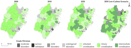 Based on the land-use efficiency data of counties (cities, districts) in Fujian Province in 2000, 2010, 2020, and 2030, the temporal and spatial evolution was comprehensively analyzed. According to the prediction results from the 2030 low-carbon development scenario, Fujian Province can reduce carbon emissions and achieve economic growth goals while ensuring ecological benefits. Therefore, the coupling and coordination relationship between land-use benefits under the 2030 low-carbon development scenario is focused on below.