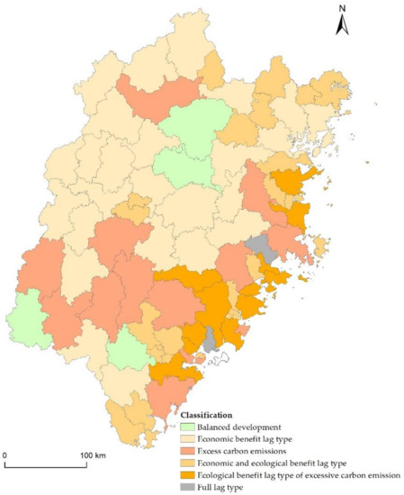 Based on the assessed value of economic benefits, ecological benefits, and carbon emissions of counties (cities, districts) in Fujian Province under the low-carbon development scenario in 2030, eight types of restrictions (Table 11) are further identified. These are factors that limit the coupling and coordination degree of land-use benefits in different regions. , , and represent the land-use economic benefits, carbon emissions, and ecological benefits of counties (cities, districts) in the corresponding years, respectively. , , and represent the average values of economic benefits, carbon emissions, and ecological benefits of regional land use in the corresponding years, respectively. These can be divided into the single-factor influence type and compound-factor influence type. The single-factor influence is due to the lag or excess of economic, ecological, and carbon emissions. These affect the improvement of coupling coordination, including economic benefit lag, carbon emission excess, and ecological benefit lag. The influence of composite factors, that is, the improvement of the coupling relationship is restricted by two or three factors. These include the excessive carbon emission of economic lag, the lagging economic benefits, the lagging ecological benefits of excessive carbon emission, and comprehensive lagging.