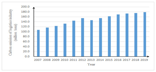 With the rapid growth of the digital economy and urbanization, logistics is playing a more and more important role in China, which approximately contributes 4.5 percent of the growth of gross domestic product (GDP) and 3 to 5 percent of the total employment [1]. However, according to CEADs, logistics is the second-largest energy consumer and carbon emitter only next to industry in 2020 in China. The energy consumption of China’s logistics soared from 122 million tce in 2007 to 205 million tce in 2019 [2]. Among the energy used, the consumption of diesel alone has increased by 3.4 million tons per year. Too much energy consumption has caused serious carbon emissions and environmental pollution. Figure 1 indicates that the carbon emissions of China’s logistics reached 179 million tons in 2019, with an annual growth rate of about 5.6%, showing a significant growth trend.