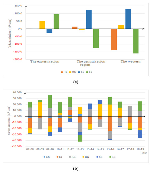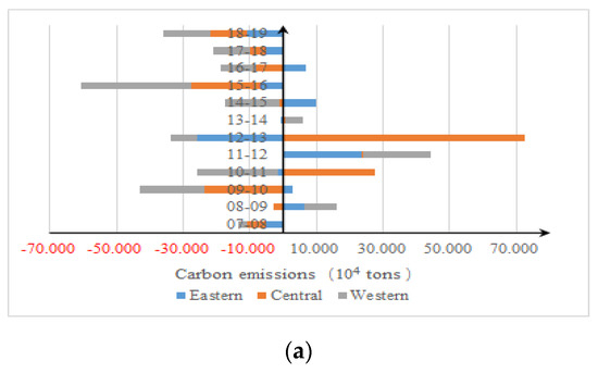 According to Figure 4a, the average value of CUE in eastern, central, and western regions was −6 thousand tons, 19 thousand tons, and −87 thousand tons respectively, indicating that the eastern and western regions caught up to the benchmark, while the central region lagged behind the benchmark in carbon emission reduction of logistics. The absolute value of CUE in the eastern region was always small, especially after 2013, indicating that the eastern region has a low potential to reduce carbon emissions of logistics. Meanwhile, the absolute values of CUE in central and western regions were big, meaning that there is a large potential to reduce carbon emissions of logistics in those two regions.