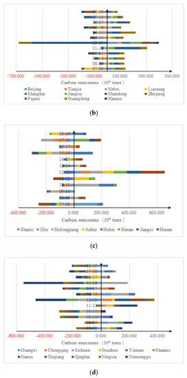 Based on Figure 4b, among the eastern regions, the average value of CUE in seven provinces is less than 0, and the average CUE of Hebei (−226), Tianjin (−191), and Hainan (−167) is particularly significant. Tianjin and Hainan have consistently shown the catch-up effect. However, the average CUE of Guangdong (285) and Jiangsu (256) is greater than 0, indicating that those provinces were lagging behind the benchmark in carbon emissions reduction of logistics. According to Figure 4c, the CUE of most central provinces has increased, such as Henan and Hubei. Moreover, Jilin has always shown a catch-up effect, and Shanxi has also begun to show a stable catch-up effect since 2013, but the CUE of Hunan has been increasing since 2012. According to Figure 4d, most western provinces, such as Qinghai and Ningxia, have shown a catch-up effect in the past decade, but the CUE of Sichuan has increased rapidly since 2013.